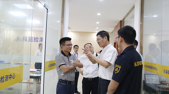 (汪會(huì)長(zhǎng)在陳董事長(zhǎng)的陪同下參觀公司展廳) (汪會(huì)長(zhǎng)認(rèn)真聽取縱覽集團(tuán)董事長(zhǎng)助理兼工廠副總監(jiān)蘇宏發(fā)對(duì)公司產(chǎn)品的介紹) (雙方在縱覽集團(tuán)檢測(cè)中心邊參觀邊交流) (汪會(huì)長(zhǎng)在陳董事長(zhǎng)的陪同下參觀車間) |