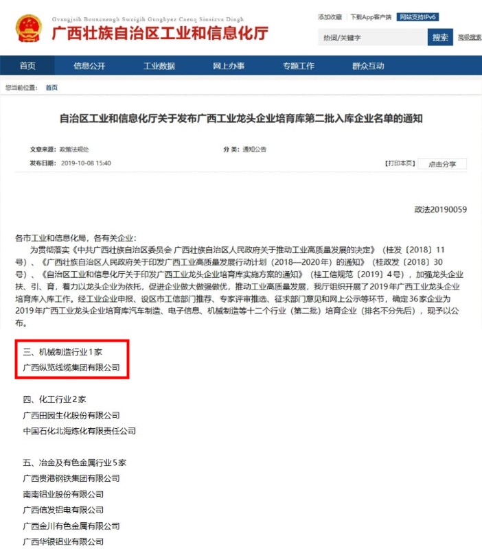 近日,在廣西壯族自治區(qū)工業(yè)和信息化廳下達(dá)的《關(guān)于發(fā)布廣西工業(yè)龍頭企業(yè)培育庫(kù)第二批入庫(kù)企業(yè)名單的通知》中,廣西縱覽線(xiàn)纜集團(tuán)有限公司成為廣西機(jī)械制造行業(yè)第二批唯一的入庫(kù)企業(yè),獲“廣西工業(yè)龍頭企業(yè)”榮譽(yù)稱(chēng)號(hào)。