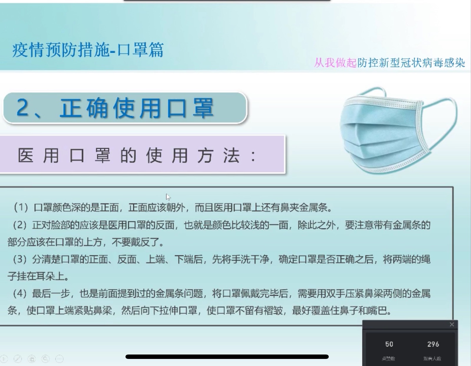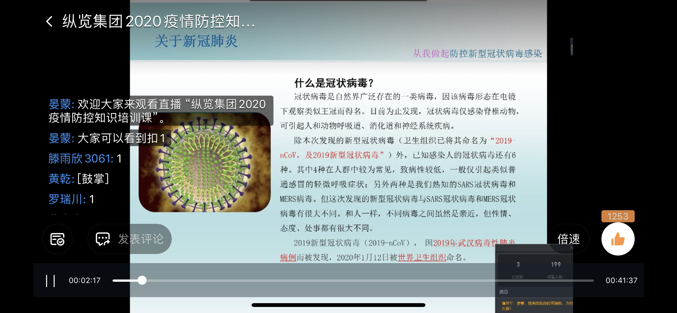 2月17日20點(diǎn)20分,廣西縱覽線纜集團(tuán)人力行政中心工作人員晏蒙以釘釘直播的形式,向全體員工進(jìn)行了一次新冠肺炎防控知識(shí)培訓(xùn),幫助大家正確認(rèn)識(shí)新型冠狀病毒,掌握科學(xué)防護(hù)方法。 “為了讓大家科學(xué)正確地了解防控知識(shí),今天我們以一種不一樣的模式開啟這堂培訓(xùn)課……”在此次視頻直播里,主播的語言生動(dòng)有趣又嚴(yán)謹(jǐn)科學(xué),同事們聽得津津有味。 本次直播分三個(gè)部分:一是關(guān)于新冠肺炎的相關(guān)知識(shí),二是疫情最新動(dòng)態(tài),三是疫情預(yù)防措施。 “效果非常好,語言清晰很流利!”低壓電纜事業(yè)部田利國觀看直播后說道。 直播結(jié)束后,300多位員工在線完成并通過了本次新型冠狀病毒防治閉卷考試。 |