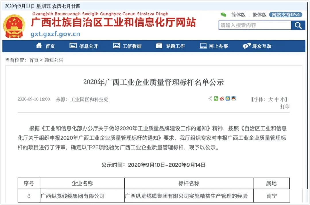 9月10日,自治區(qū)工業(yè)和信息化廳公布2020年廣西工業(yè)企業(yè)質(zhì)量管理標(biāo)桿名單,《廣西縱覽線纜集團(tuán)有限公司實(shí)施精益生產(chǎn)管理的經(jīng)驗(yàn)》成為廣西工業(yè)企業(yè)質(zhì)量管理標(biāo)桿名列其中。