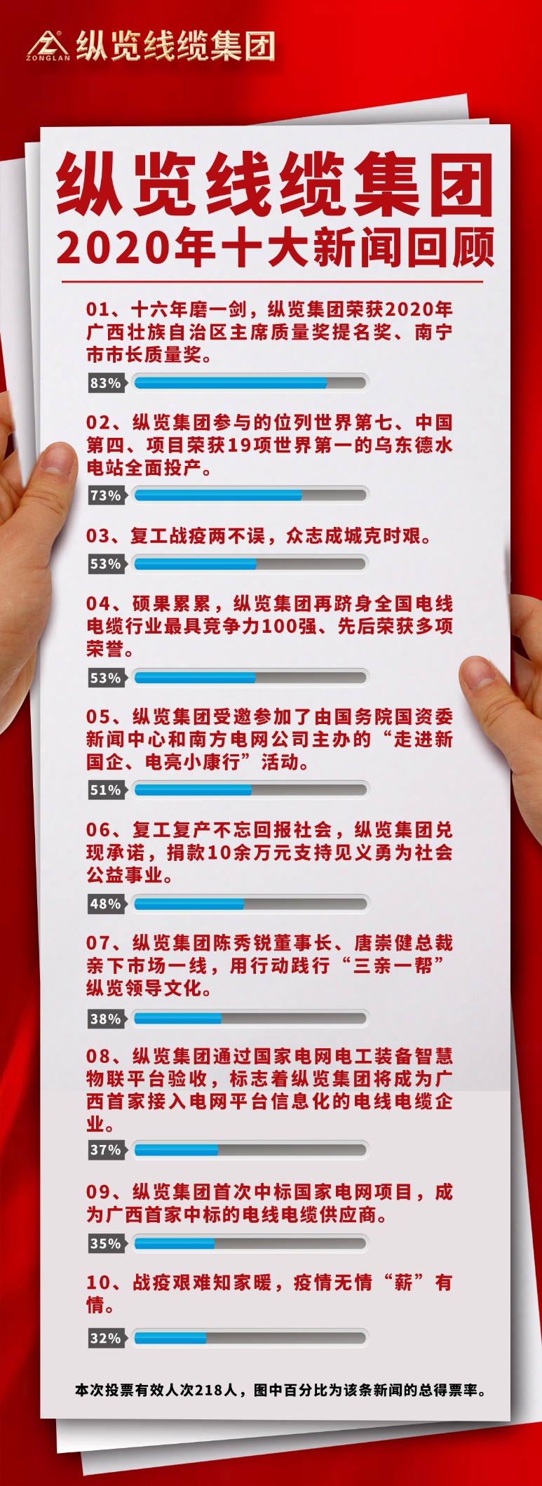 為了讓更多的縱覽人主動關(guān)心公司的發(fā)展與成長,共享成果的自豪與榮耀,值此一元復(fù)始之際,公司特舉辦“2020年度十大新聞”評選活動,經(jīng)過大家的積極投票,評選出了“縱覽線纜集團(tuán)2020年度十大新聞”,讓我們一起來回顧一下! 1、復(fù)工戰(zhàn)疫兩不誤,眾志成城克時艱。 2020年1月26日大年初二起,縱覽人即同全國人民一起防疫戰(zhàn)疫,與“新冠肺炎病毒”展開了一場生死的較量。1月30日當(dāng)全國人民還放放假閉關(guān)中,縱覽即因戰(zhàn)疫需要,成立了以陳秀銳董事長為首的“縱覽疫情防控支援突擊隊”,快速啟動突發(fā)事件應(yīng)急預(yù)案,先后組織向各地電網(wǎng)救災(zāi)一線勇士們捐獻(xiàn)疫情緊缺物資口罩一萬枚,緊急組織供貨約2000萬元的電纜援建“小湯山式”疫情醫(yī)院……縱覽戰(zhàn)疫故事先后被廣西電視臺、電線電纜報、中國機(jī)械工業(yè)協(xié)會等多家媒體多次報道,成為抗擊疫情行動的先進(jìn)單位。 疫情防控關(guān)乎生命,而安全復(fù)工則關(guān)乎員工生計、企業(yè)的命脈和社會穩(wěn)定,因此,如何安全復(fù)工,減少疫情對經(jīng)濟(jì)的影響、對企業(yè)和員工的影響是企業(yè)疫情防控之外的另一場硬仗。萬難之際,縱覽人眾志成城,從疫情防護(hù)物資的急采配置、廠區(qū)嚴(yán)控出入、員工日健康信息報告、返廠隔離、防疫培訓(xùn)、用餐隔離到公司領(lǐng)導(dǎo)精準(zhǔn)施策、管理層執(zhí)行不打折扣,加班產(chǎn)出、加班發(fā)貨等等,無不顯示出縱覽人將壓力變?yōu)閯恿Α⒒闄C(jī)、戰(zhàn)勝疫情和經(jīng)濟(jì)壓力的勇氣和信心。 2、十六年磨一劍,縱覽集團(tuán)榮獲2020年廣西壯族自治區(qū)主席質(zhì)量獎提名獎、南寧市市長質(zhì)量獎。 十六年磨一劍,2020年12月,縱覽集團(tuán)先后榮獲廣西壯族自治區(qū)主席質(zhì)量獎提名獎、南寧市市長質(zhì)量獎,企業(yè)經(jīng)營成果和質(zhì)量管理水平得到政府部門的高度認(rèn)可。 面對集團(tuán)首次申報、經(jīng)驗不足、競爭強(qiáng)手如林的不利情況下,陳秀銳董事長要求創(chuàng)獎團(tuán)隊誓必成功,唐崇健總裁帶領(lǐng)創(chuàng)獎團(tuán)隊擰成一股繩,日以繼夜,以卓越績效管理體系為綱,不斷突破、對公司各業(yè)務(wù)版塊的信息資料進(jìn)行收集和整理,通過多次會議和頭腦風(fēng)暴,深挖亮點,組織編寫了超17萬字的創(chuàng)獎申報材料、制作了15個現(xiàn)場匯報的PPT,同時,通過對匯報和評審的反復(fù)演練,終于在各環(huán)節(jié)以出色的表現(xiàn)贏得了評審專家的肯定,獲得了高分,一鼓作氣連續(xù)拿下廣西壯族自治區(qū)主席質(zhì)量獎提名獎和南寧市市長質(zhì)量獎,成為創(chuàng)獎企業(yè)中的黑馬。 廣西壯族自治區(qū)主席質(zhì)量獎是廣西壯族自治區(qū)實施質(zhì)量興桂戰(zhàn)略工作領(lǐng)導(dǎo)小組組織實施,主要授予有廣泛的社會知名度和影響力、實施卓越績效管理模式、質(zhì)量管理水平和自主創(chuàng)新能力在國內(nèi)同行業(yè)處于領(lǐng)先地位、取得顯著經(jīng)濟(jì)效益和社會效益的企業(yè)和相關(guān)組織,該獎項評選標(biāo)準(zhǔn)高、評審過程嚴(yán),每屆獲獎的企業(yè)或組織總數(shù)不超過4個,提名獎不超過8個??v覽集團(tuán)作為民營企業(yè),能在強(qiáng)手如林的國企、央企、上市公司中脫穎而出,獲得政府和各界的認(rèn)可,實屬不易。 3、戰(zhàn)疫艱難知家暖,疫情無情“薪”有情。 2020年1月底,因疫情影響企業(yè)復(fù)工延期,部分企業(yè)被迫停產(chǎn)、陷入經(jīng)營危機(jī)。為讓縱覽家人安心 ,公司及時發(fā)布疫情時期的薪資發(fā)放政策,政策不僅明確了員工疫情時期的生活保障,還暖心地對疫情期奮戰(zhàn)在生產(chǎn)一線的操作工、保安人員給予了工資以外的激勵補(bǔ)貼,讓員工們在不安的環(huán)境中因企業(yè)的擔(dān)當(dāng)而感受到了安全,感受到了艱難時公司對員工的關(guān)愛和縱覽大家庭的溫暖。