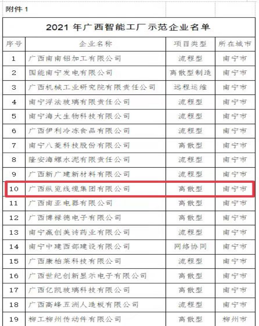 12月3日,自治區(qū)工業(yè)和信息化廳發(fā)布了關(guān)于公布2021年廣西智能工廠示范企業(yè)和數(shù)字化車(chē)間名單的通知,我集團(tuán)成功入選2021年廣西智能工廠示范企業(yè)名單,獲得“廣西智能工廠示范企業(yè)”榮譽(yù)稱(chēng)號(hào)。標(biāo)志著縱覽線纜集團(tuán)生產(chǎn)制造、產(chǎn)品質(zhì)量把控能力和水平邁上一個(gè)新的臺(tái)階,市場(chǎng)競(jìng)爭(zhēng)力進(jìn)一步增強(qiáng)。 |