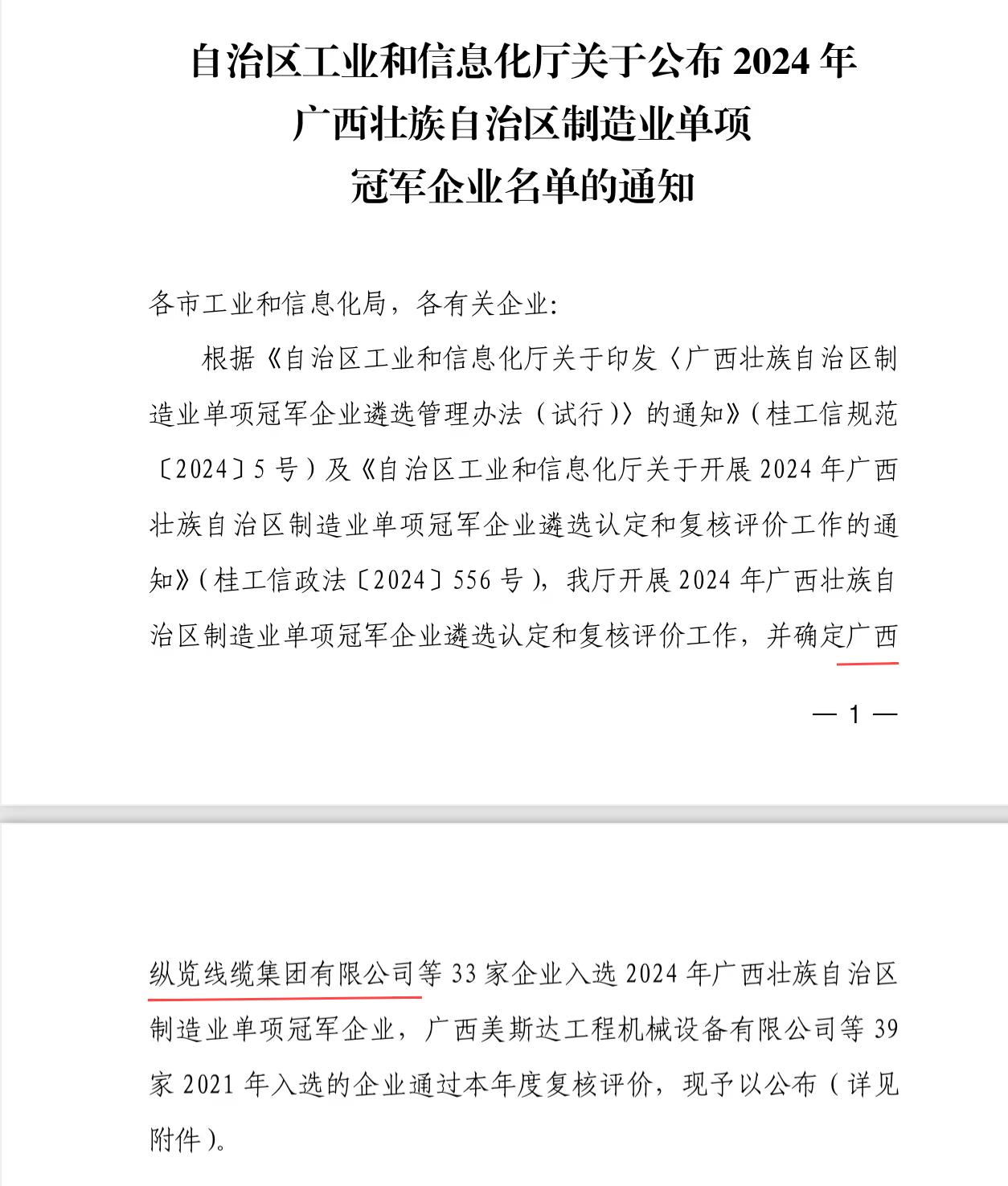 近日,自治區(qū)工業(yè)和信息化廳正式公示2024年自治區(qū)制造業(yè)單項冠軍企業(yè)名單,其中涉及多個當下熱門的制造業(yè)創(chuàng)新領域,經(jīng)過遴選和復核評價工作,廣西縱覽線纜集團有限公司憑借卓越的綜合企業(yè)實力,被授予2024年【廣西壯族自治區(qū)制造業(yè)單項冠軍企業(yè)】稱號! 據(jù)悉,自治區(qū)制造業(yè)單項冠軍的評選,目的在于激勵和表彰在制造業(yè)領域具有顯著技術(shù)創(chuàng)新能力和市場競爭力的企業(yè)。評選過程中,專家組對參評企業(yè)的技術(shù)實力、產(chǎn)品創(chuàng)新能力、市場表現(xiàn)等多個維度進行全面評估,最終評選出了包括廣西縱覽線纜集團有限公司在內(nèi)的33家企業(yè)為單項冠軍企業(yè)。 此次獲得單項冠軍的榮譽,對縱覽線纜集團而言,既是對其過往努力的肯定,亦是對其未來發(fā)展的激勵。展望未來,集團將致力于發(fā)揮制造業(yè)單項冠軍企業(yè)的示范與引領作用,持續(xù)秉承以“做好產(chǎn)品回報客戶,做好企業(yè)回報社會”的企業(yè)使命,堅持以技術(shù)創(chuàng)新為核心,不懈努力提升產(chǎn)品質(zhì)量與服務水平,致力于為用戶提供更加優(yōu)質(zhì)、高效的電線電纜產(chǎn)品和服務。此外,公司亦將積極投身于行業(yè)內(nèi)的交流與合作,為推動行業(yè)高質(zhì)量發(fā)展蓄勢賦能。 |