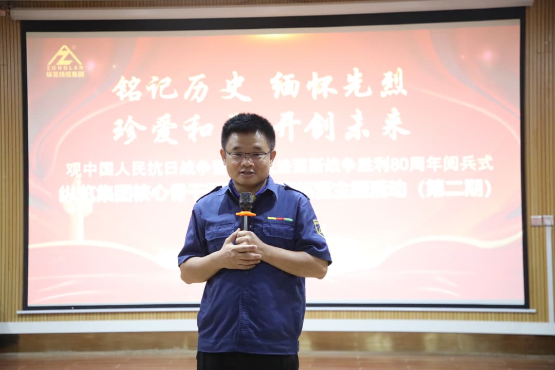 在中國人民抗日戰(zhàn)爭勝利80周年之際,偉大抗戰(zhàn)浩氣凜然,精神弘揚至關(guān)重要。9月3日,縱覽集團組織公司全體核心骨干集中觀看中國人民抗日戰(zhàn)爭暨世界反法西斯戰(zhàn)爭勝利 80 周年閱兵儀式作為一次愛國愛黨思政教育培訓(xùn)活動。旨在引導(dǎo)公司核心骨干銘記歷史、珍愛和平、開創(chuàng)未來,傳承弘揚浴血奮斗鑄就的偉大抗戰(zhàn)精神,從歷史榮光與國防力量中汲取精神養(yǎng)分,強化核心骨干團隊的使命擔(dān)當(dāng)與奮斗精神,將愛國情懷轉(zhuǎn)化為推動企業(yè)高質(zhì)量發(fā)展的實干動力,用偉大的抗戰(zhàn)精神和閱兵儀式中所展示的國家實力與民族自信心激勵公司骨干發(fā)揮表率作用在踐行“做好產(chǎn)品回報客戶、做好企業(yè)回報社會,做最好的線纜”初心使命。集團董事長陳秀銳、總經(jīng)理陳思行出席并講話,常務(wù)副總經(jīng)理陳思源,副總經(jīng)理吳培軍、陳楊、張彩菊,總工程師劉小祥出席活動。