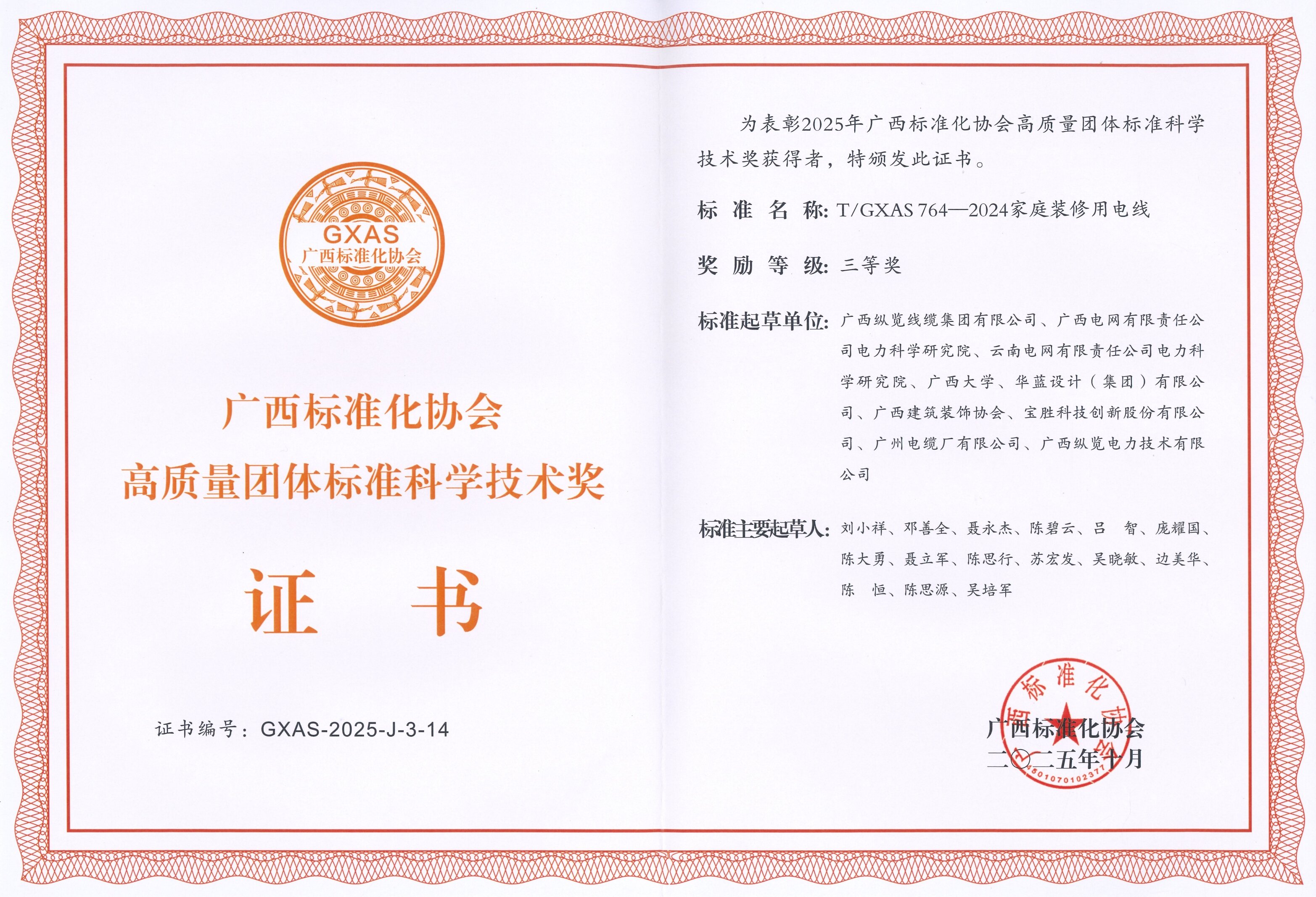 10月9日, 由中國(guó)標(biāo)準(zhǔn)化協(xié)會(huì)指導(dǎo),廣西標(biāo)準(zhǔn)化協(xié)會(huì)主辦,以及廣西36家協(xié)會(huì)/學(xué)會(huì)承辦的《“八桂科技講壇” 2025年世界標(biāo)準(zhǔn)日宣傳活動(dòng)暨廣西第二屆高質(zhì)量團(tuán)體標(biāo)準(zhǔn)科學(xué)技術(shù)獎(jiǎng)勵(lì)及學(xué)術(shù)交流大會(huì)》在南寧沃頓國(guó)際大酒店順利召開(kāi)。 由廣西縱覽線纜集團(tuán)有限公司、廣西電網(wǎng)有限責(zé)任公司電力科學(xué)研究院、云南電網(wǎng)有限責(zé)任公司電力科學(xué)研究院、廣西大學(xué)、華藍(lán)設(shè)計(jì)(集團(tuán))有限公司、廣西建筑裝飾協(xié)會(huì)、寶勝科技創(chuàng)新股份有限公司、廣州電纜廠有限公司、廣西縱覽電力技術(shù)有限公司9家單位共同起草編制的《T/GXAS 764—2024家庭裝修用電線》榮獲《廣西標(biāo)準(zhǔn)化協(xié)會(huì)高質(zhì)量團(tuán)體標(biāo)準(zhǔn)科學(xué)技術(shù)獎(jiǎng)三等獎(jiǎng)》。 《家庭裝修用電線》這一團(tuán)體標(biāo)準(zhǔn),由廣西縱覽線纜集團(tuán)主導(dǎo)編制,全面且細(xì)致地規(guī)定了家庭裝修用電線的質(zhì)量要求。該標(biāo)準(zhǔn)的出臺(tái),對(duì)確保家庭裝修用電線的質(zhì)量、推動(dòng)其廣泛應(yīng)用以及保障家庭用電安全,意義重大。同時(shí),該標(biāo)準(zhǔn)的有效實(shí)施,將更好促進(jìn)家庭裝修用電線生產(chǎn)企業(yè)的技術(shù)水平顯著提高,對(duì)引領(lǐng)推動(dòng)家庭裝修用電線高質(zhì)量快速發(fā)展發(fā)揮重要作用。 大會(huì)交流期間,公司總工程師劉小祥向中國(guó)工程院院士、國(guó)際電工委員會(huì)(IEC)第36屆主席舒印彪院士等介紹《家庭裝修用電線》標(biāo)準(zhǔn)產(chǎn)品。 此次榮獲獎(jiǎng)項(xiàng),不僅是對(duì)縱覽線纜集團(tuán)在標(biāo)準(zhǔn)化工作領(lǐng)域?qū)I(yè)能力與創(chuàng)新精神的高度認(rèn)可,更是對(duì)其積極履行社會(huì)責(zé)任、推動(dòng)電線電纜行業(yè)規(guī)范化發(fā)展所做貢獻(xiàn)的充分肯定??v覽線纜集團(tuán)始終秉持"做負(fù)責(zé)的人,做最好的線纜"的企業(yè)愿景,這一榮譽(yù)的獲得,將進(jìn)一步激勵(lì)集團(tuán)在電線電纜標(biāo)準(zhǔn)制定與技術(shù)研發(fā)方面持續(xù)投入,不斷提升產(chǎn)品質(zhì)量與服務(wù)水平,為家庭用電安全事業(yè)及行業(yè)高質(zhì)量發(fā)展貢獻(xiàn)更多力量。 |